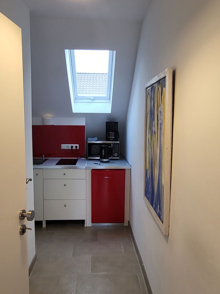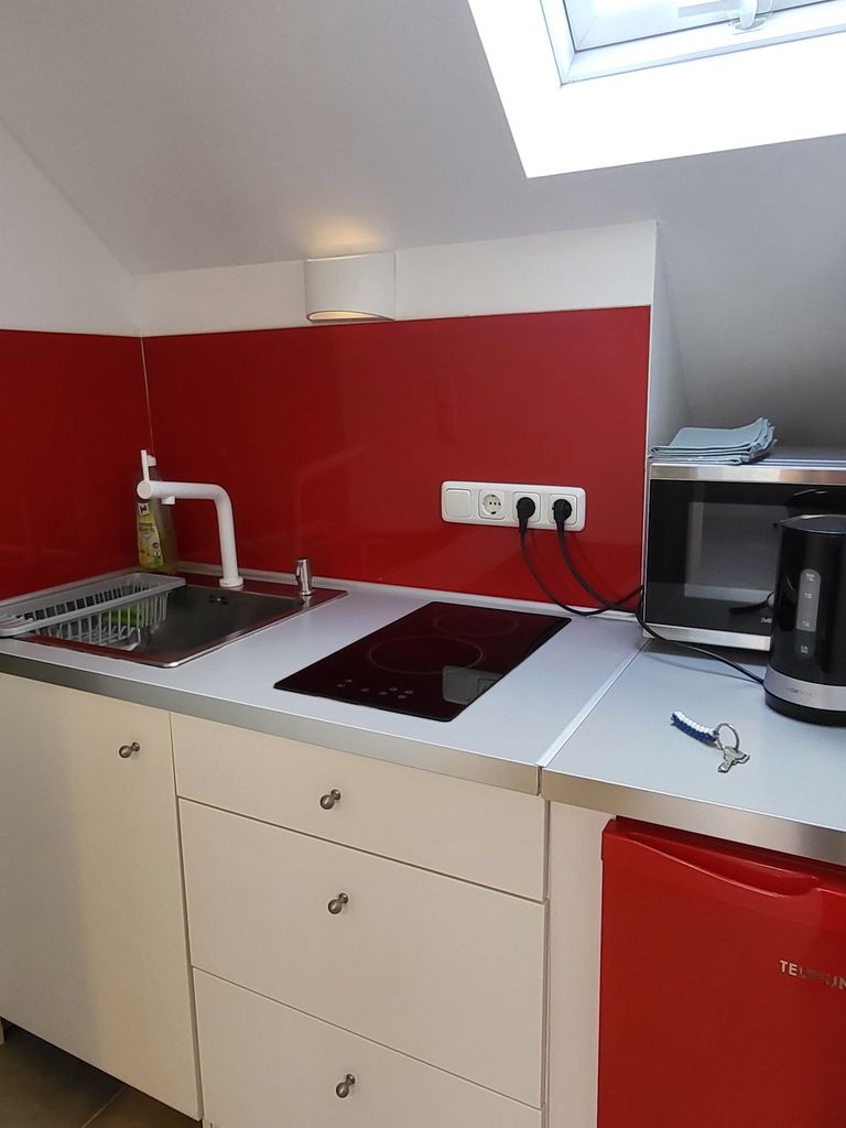 In der Miniküche finden Sie eine Mikrowelle mit kombiniertem Backofen, einen Kühlschrank inkl. Gefrierfach, eine Spüle und ein Zweier-Cerankochfeld - dort können Sie sich selbst versorgen. In der gesamten Wohnung ist wlan kostenlos verfügbar. Im Hof können Sie kostenlos parken.