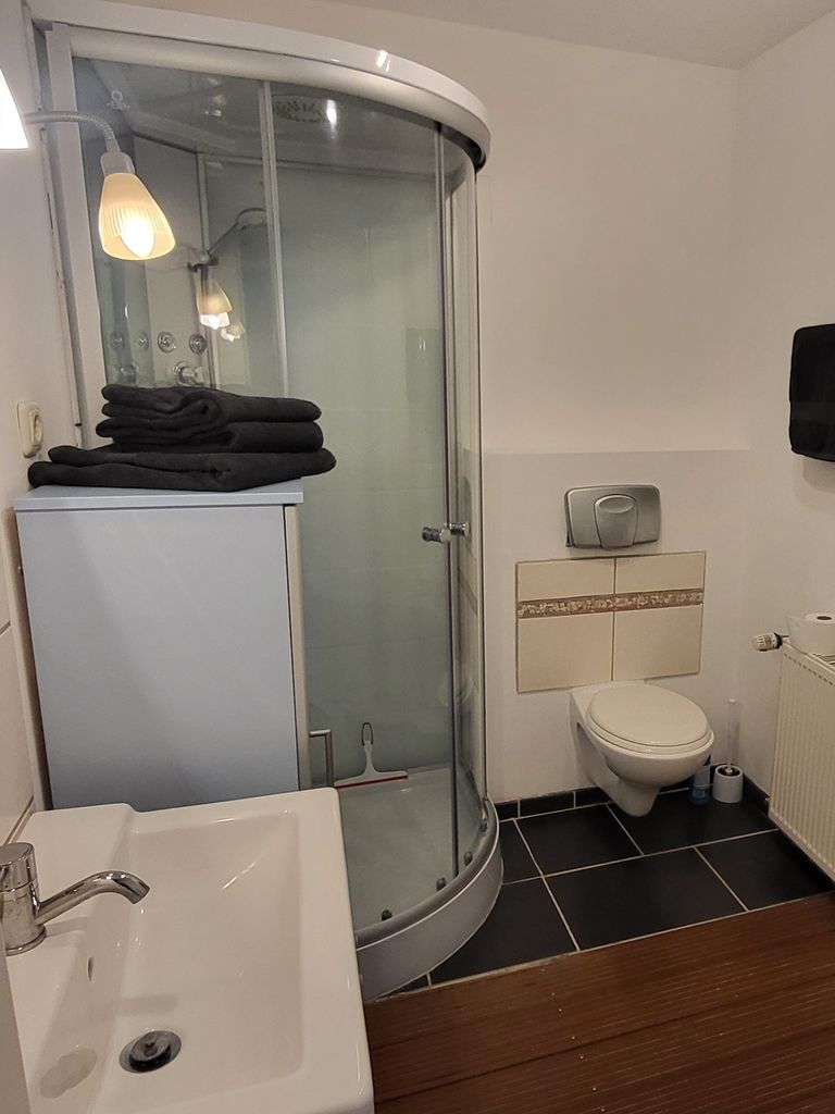 Das Duschbad ist mit einer Dusche, einem WC und einem Waschbecken ausgestattet.